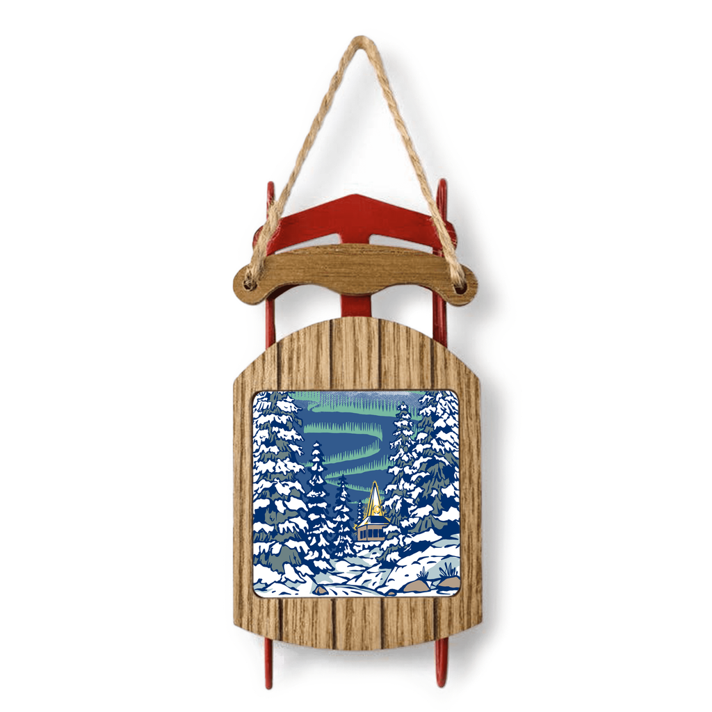 Adorable wooden sled ornament featuring our exclusive Lapland Village design, a perfect gift for everyone on your list!